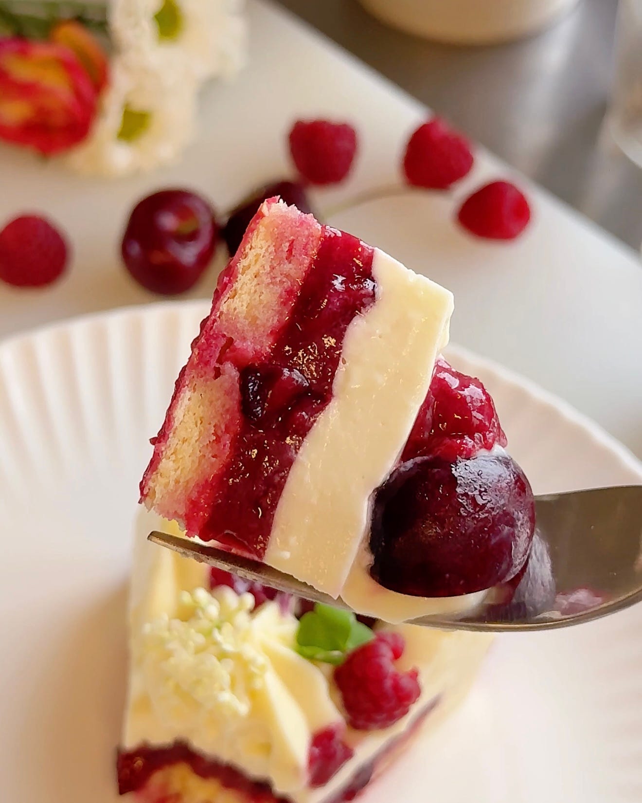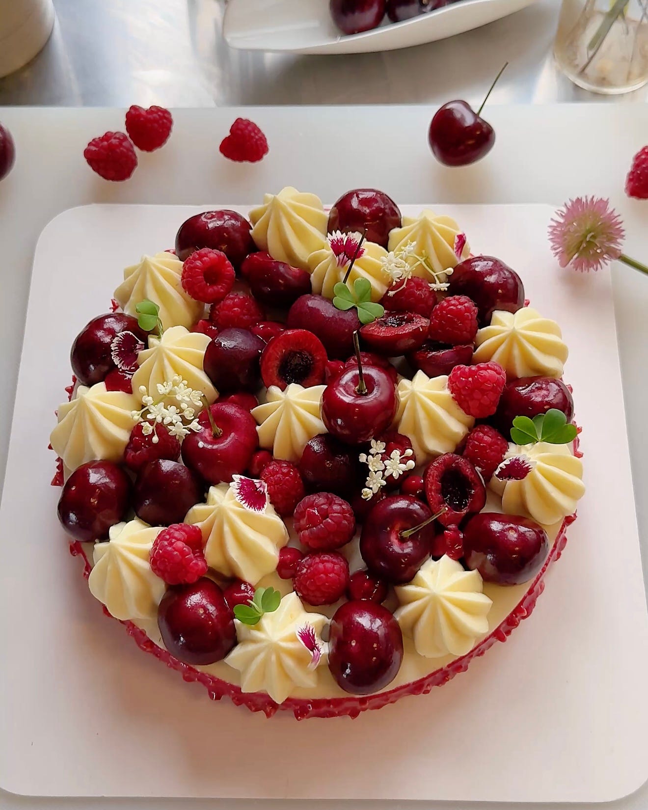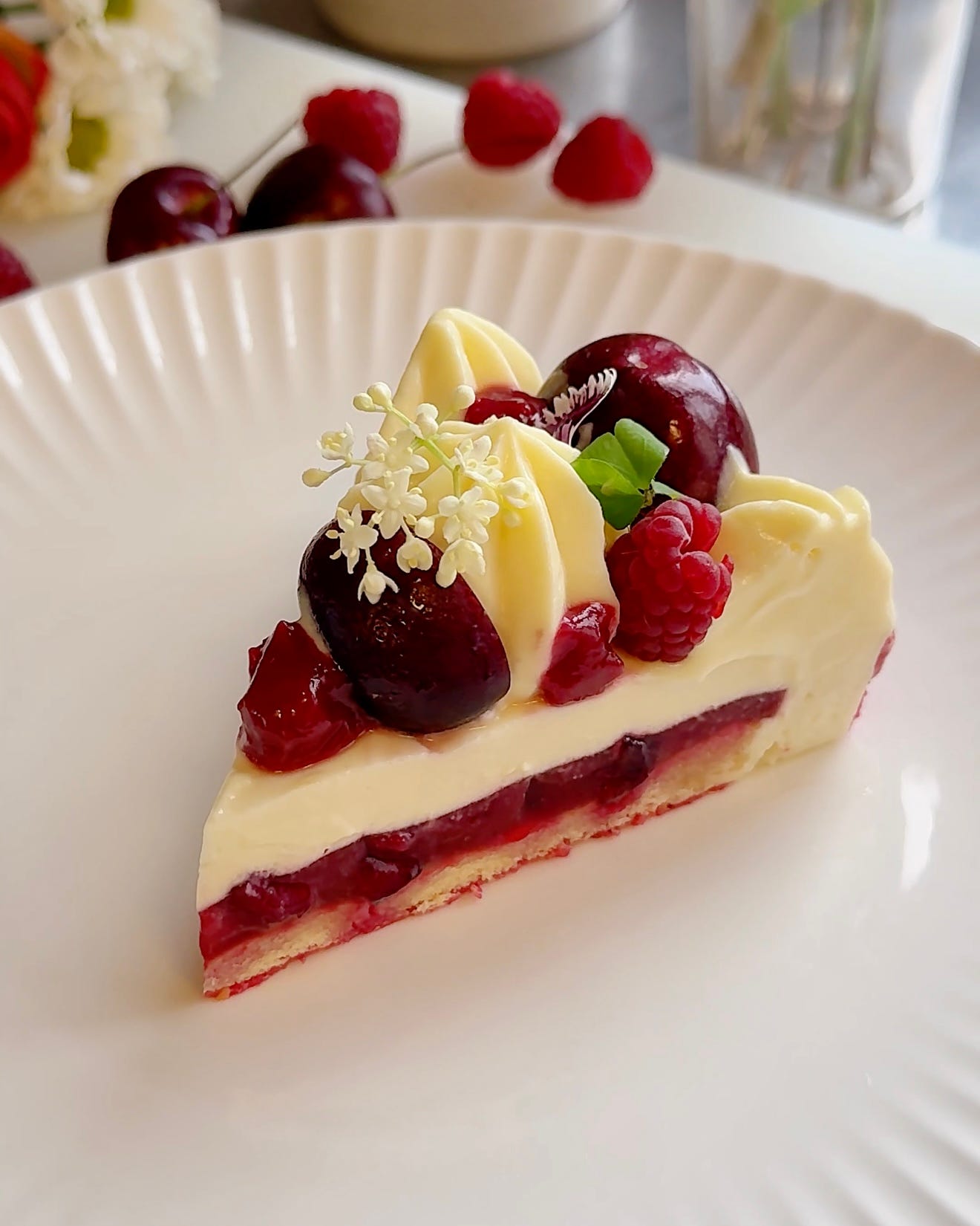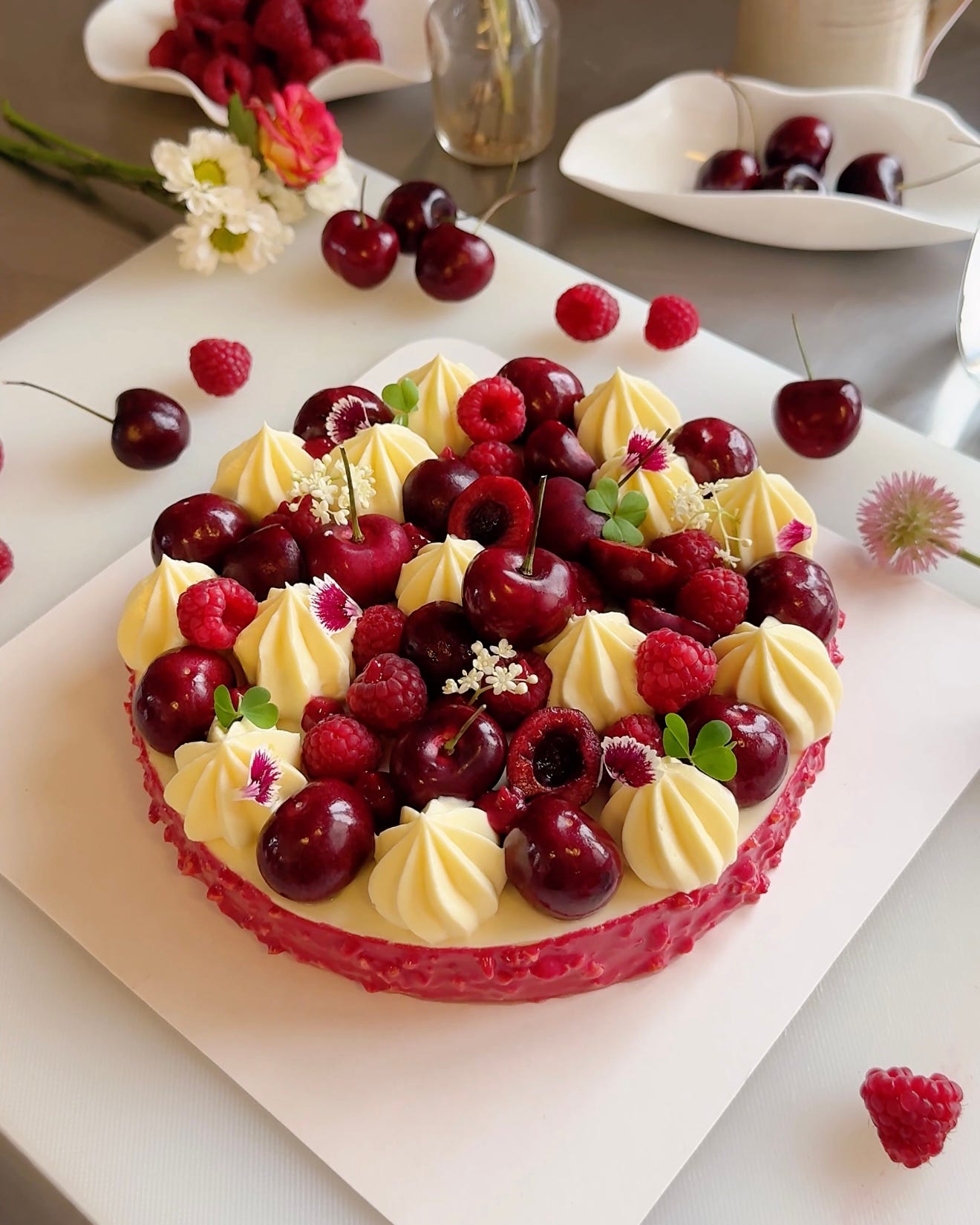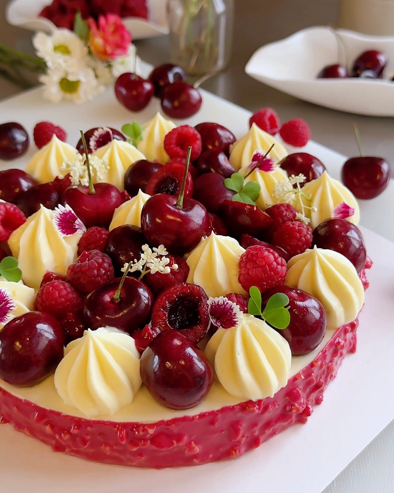 A light and elegant summer cake with layers of soft ladyfinger sponge, juicy cherry-raspberry compote, and airy vanilla rose mousse. It’s dipped in a pink chocolate almond glaze for crunch and color, then topped with white chocolate whipped ganache, fresh cherries and raspberries.